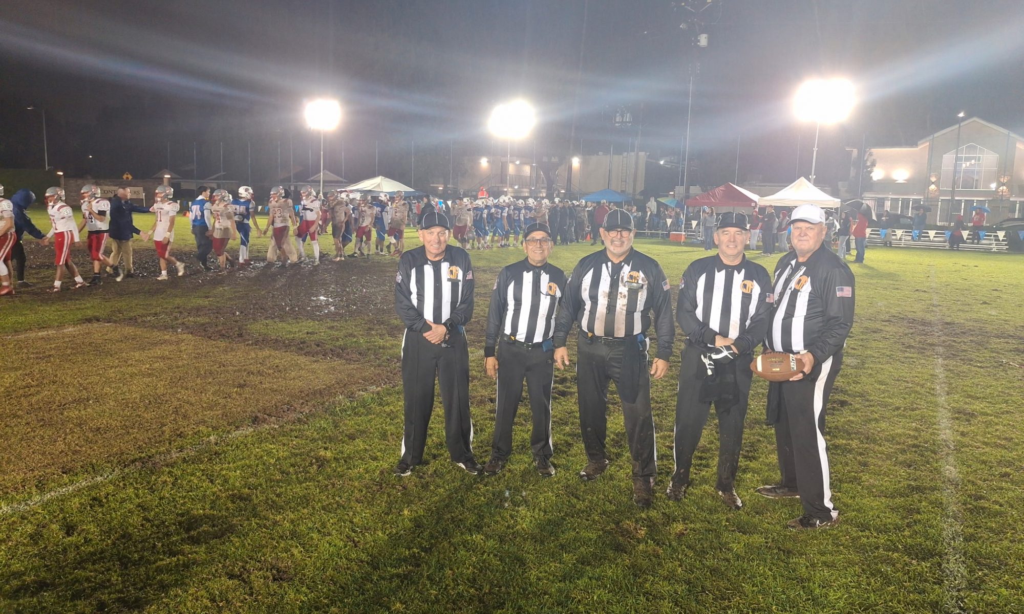 Looks like the crew had some mucky conditions in last night’s CIF-SS 8-Man Division 1 Quarterfinal game between CSDR and Faith Baptist. Pictured from left to right are: Dave Cater (H), Richard Lamas (L), Michael Guzman (U), Matt Rascon (B), and Jeff Jablonsky (R). Good luck getting that mud out of your shirt, Mike!