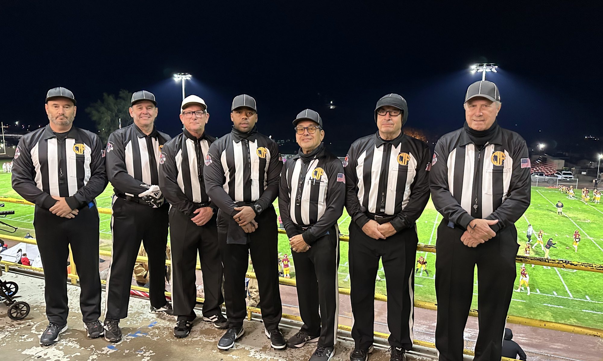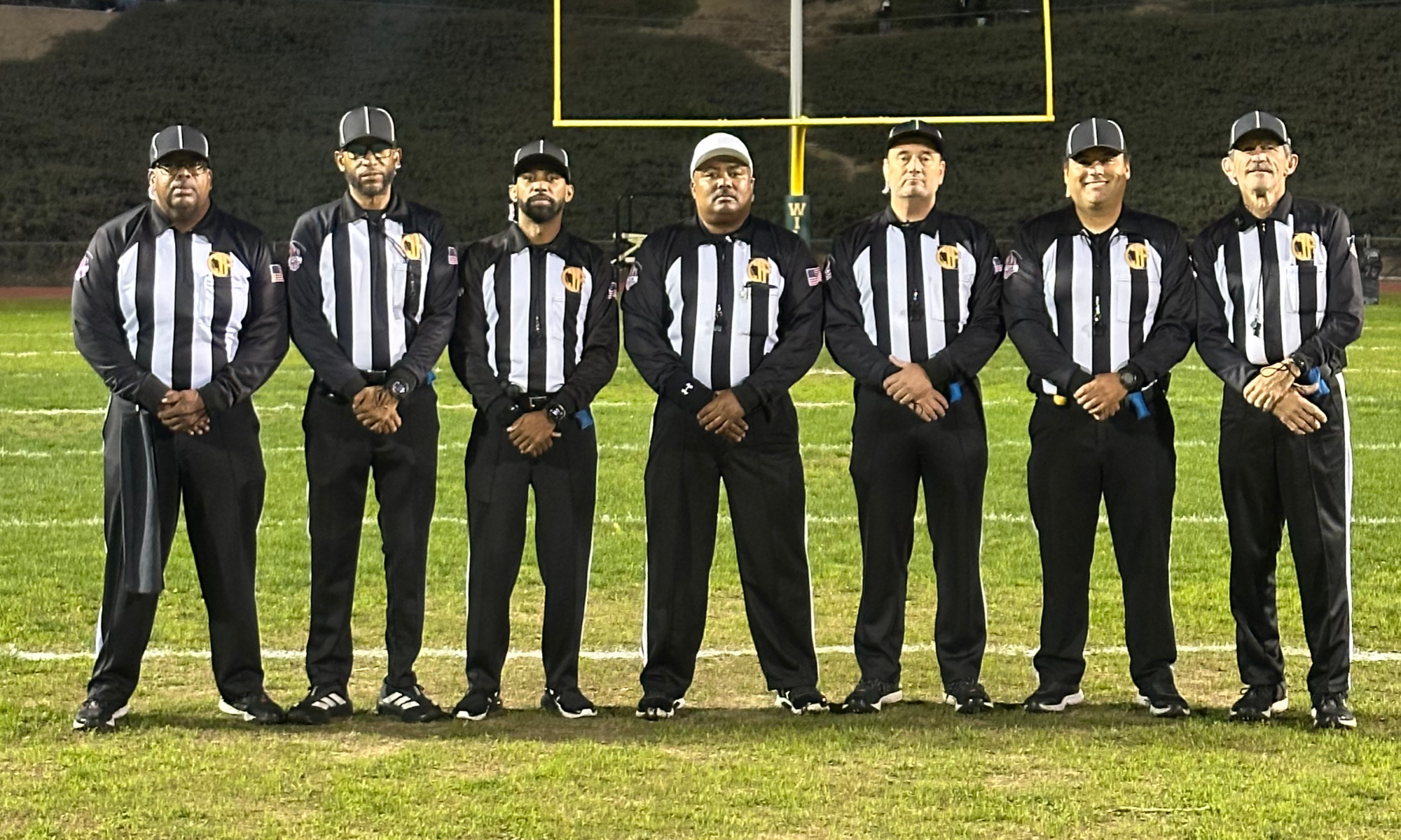 Here’s the crew from last night’s Division 7 semifinal between Palm Springs and Barstow. From left to right are Jeremy Hamlett (L), Matt Rascon (B), Tim Dow (R), Kenny James Jr. (U), Richard Lamas (S), Frank Fontes (H), and Bill Sullivan (F). Looks like it was a chilly one!