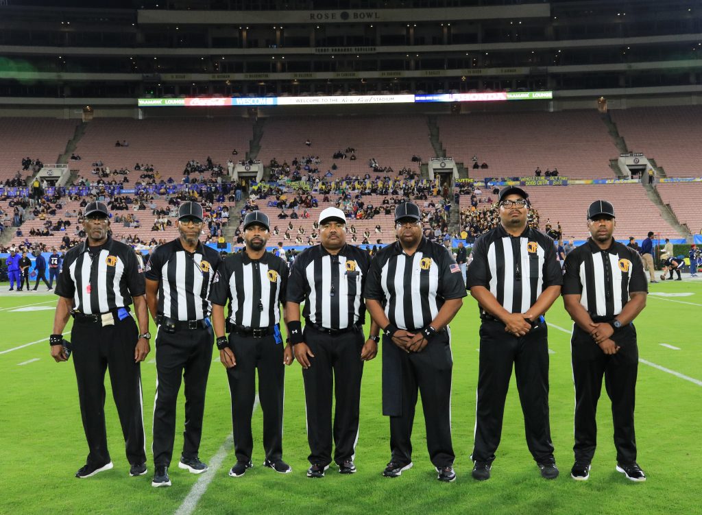 The officials for the 2025 Turkey Tussle were, from left to right: Michael Moore (LJ), Drew Benton (BJ), Christian Holloway (FJ), JT Thomas (R), Kenny James (U), Aaron Thomas (HL), and Kenny James, Jr. (SJ).